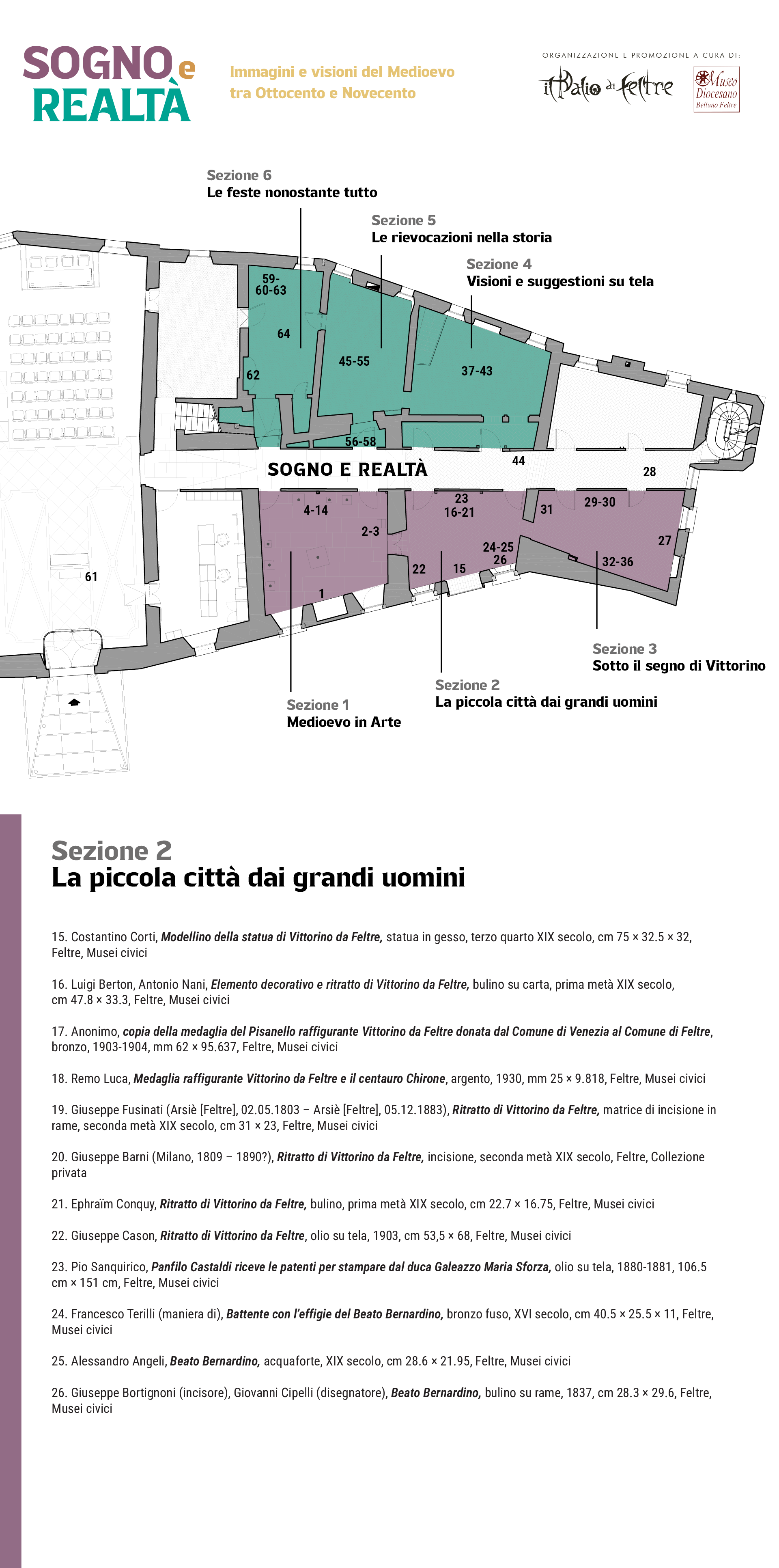 La seconda sezione della mostra conduce il visitatore alla scoperta di un Medioevo che tra Ottocento e Novecento venne rievocato, reinventato e trasformato in simbolo identitario per la città di Feltre.